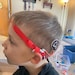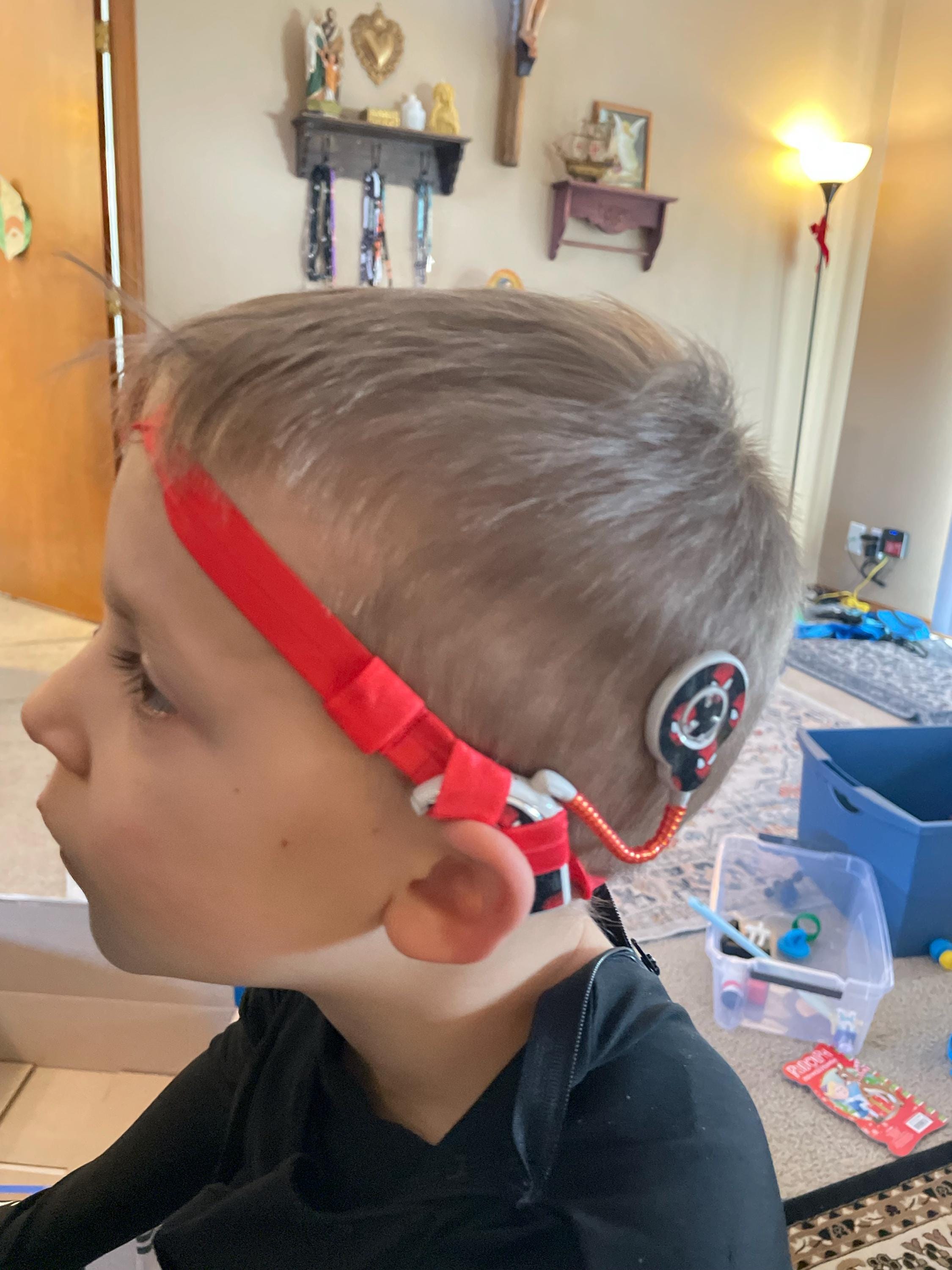 Cochlear implant 5/8" elastic headband made with four loops for bilateral users (two loops per processor). These loops are movable with the processor intended to be placed behind the ear as pictured. If you need fewer loops the extra loops can be easily cut off with scissors. The photo of child wearing headband is for demonstration purposes only.